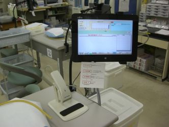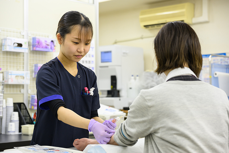 中央採血室では、オーダーリングによる外来患者さんの採血を県下2施設目の導入となる採血患者認証システム(アシストソリューション)を用いて患者確認を行ってから実施しています。また、ブドウ糖負荷試験や自己血採血も行っています。