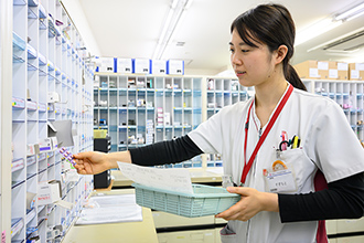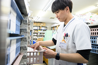 約1500品目の医薬品を取り扱い、円滑な医療を提供するために、病院全体の購入、保管、品質、供給といった薬品全般の管理を行っています。