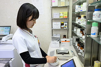 調剤室では、医師の処方した薬の量や飲み方が適正か、検査結果とも照合し問題が無いか確認してから調剤を行っています。患者さんの服用しやすいよう粉砕や一包化を行ないます。