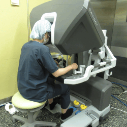 「サージョンコンソール」とよばれる操縦席に座り、3D画像を見ながら手元のコントローラーを操作します。